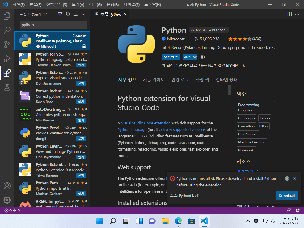 ▼ Python 개발 환경이 설치되어 있지 않은 경우, 우측 하단에 아래와 같은 경고가 나타납니다. [Download] 단추를 누릅니다.