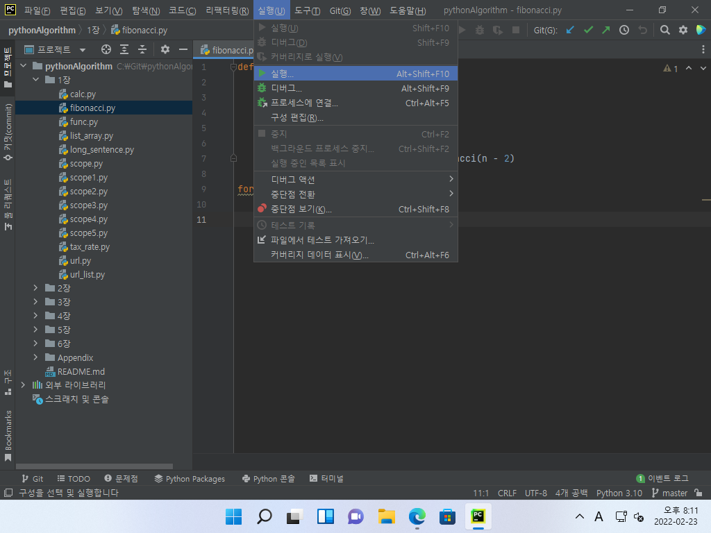 ▼ 좌측 탐색 창에서 예제 파일을 열고, [실행] 메뉴에 들어가 [실행]을 클릭합니다.