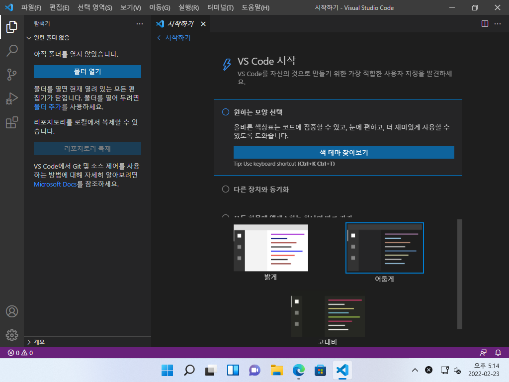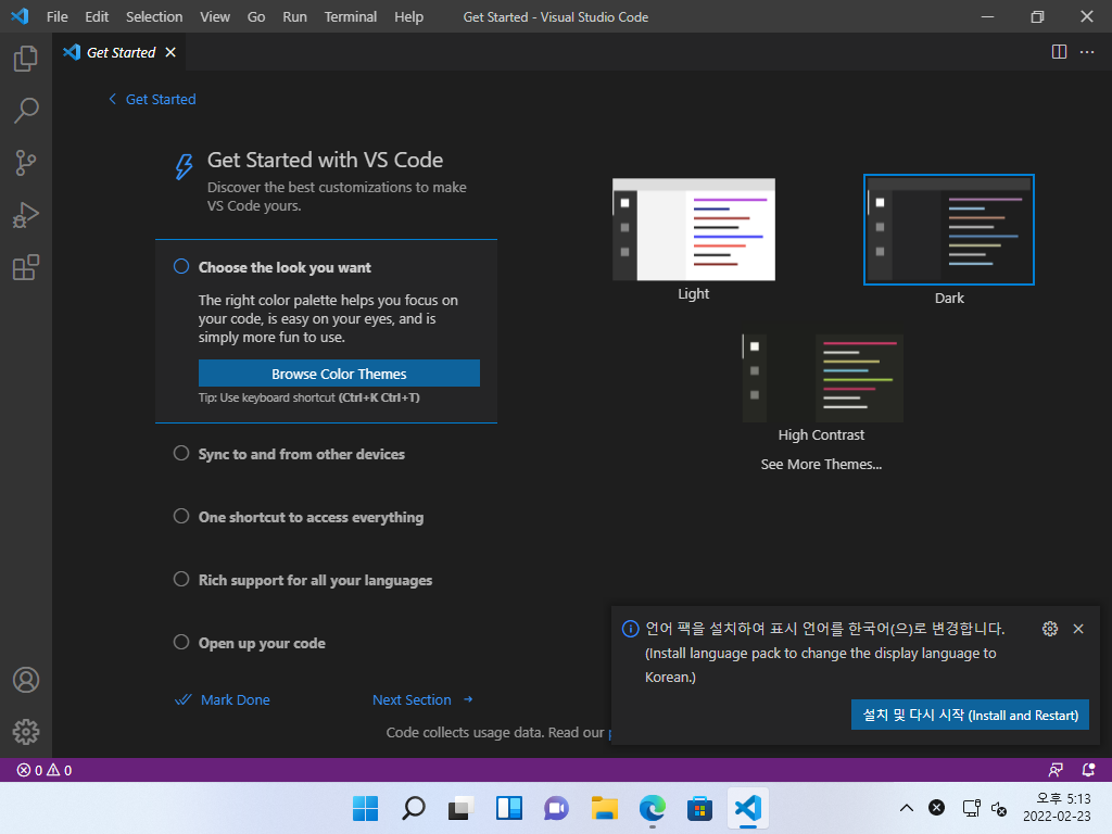 ▼ VSCode를 실행하면 한국어 언어 팩을 설치할 수 있다고 알려줍니다. 우측 하단의 버튼을 눌러 '설치 및 다시 시작'합니다.