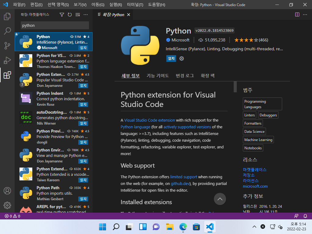 ▼ 좌측의 확장 메뉴나, 키보드 단축키로 (Ctrl+Shift+X)를 눌러 'python' 키워드로 검색합니다. Python(Microsoft 제작)이 나오면 설치 단추를 누릅니다.