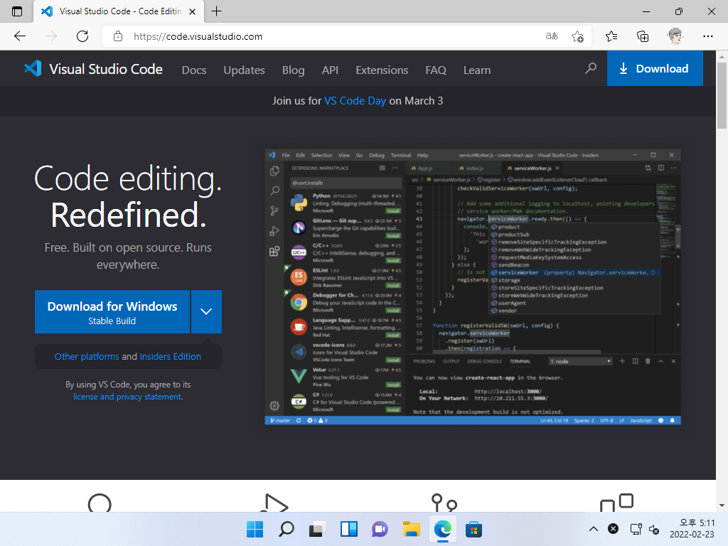 ▼ https://code.visualstudio.com/에 접속해 Visual Studio Code(VSCode)를 다운로드하여 설치합니다.